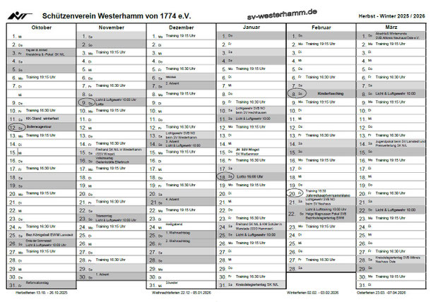 beginnt ab 16. Oktober und ist dann jeden Dienstag und Donnerstag um 19:00 Uhr. Die Staffel-Teilnehmer können jederzeit starten um ihre Disziplinen zu erfüllen. An jedem Abend kann ein Durchgang je Disziplin geschossen werden. Je Staffel sind 4 Durchgänge zu absolvieren. Der letzte Temin ist am 16. Dezember 2025